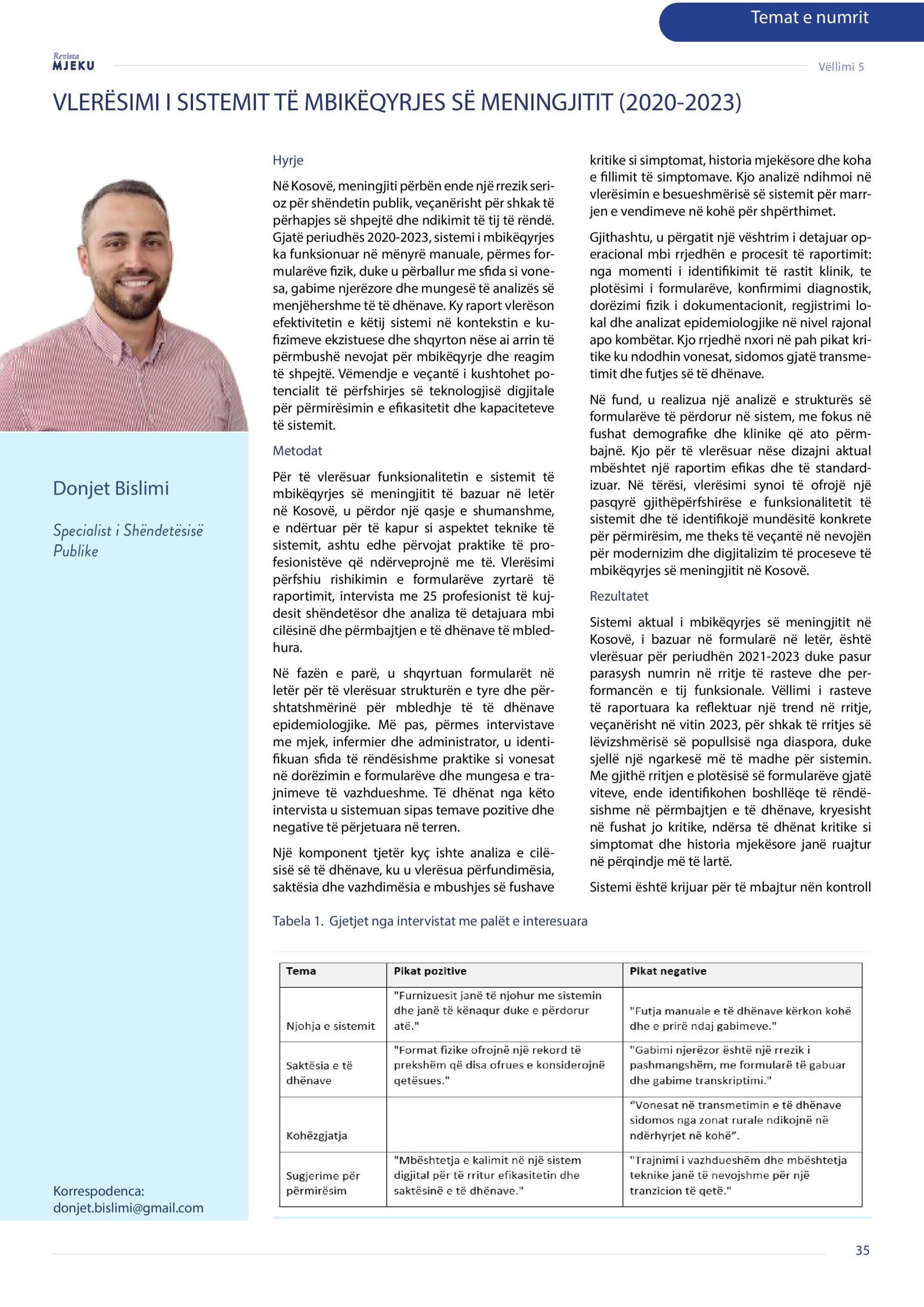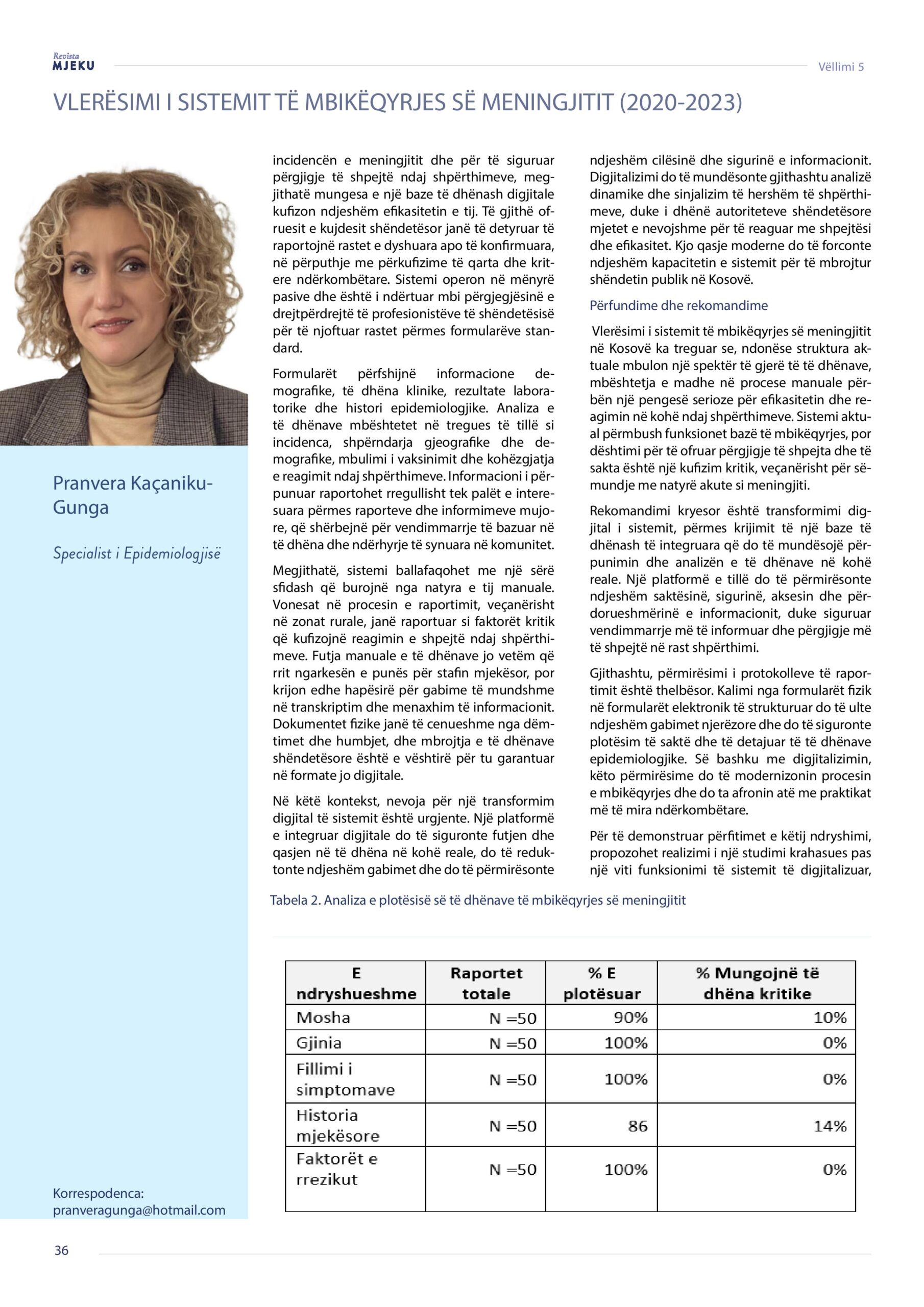 Revista Mjeku, Vëllimi 5, Numër 2; Vlerësimi i sistemit të mbikëqyrjes së mengjitit (2020 – 2023), artikull nga Donjet Bislimi, Pranvera Kaçaniku – Gunga dhe Teuta Jusufi