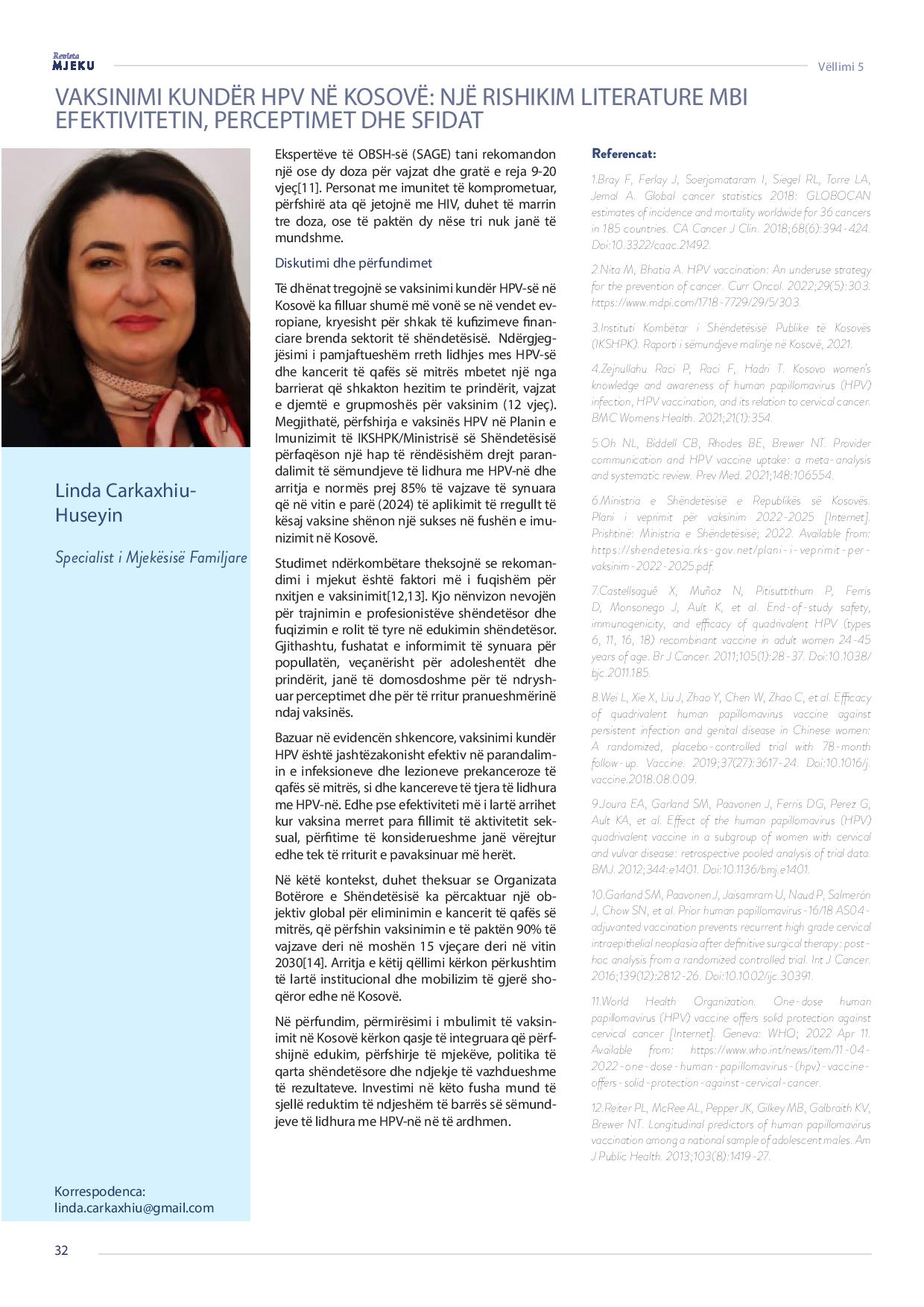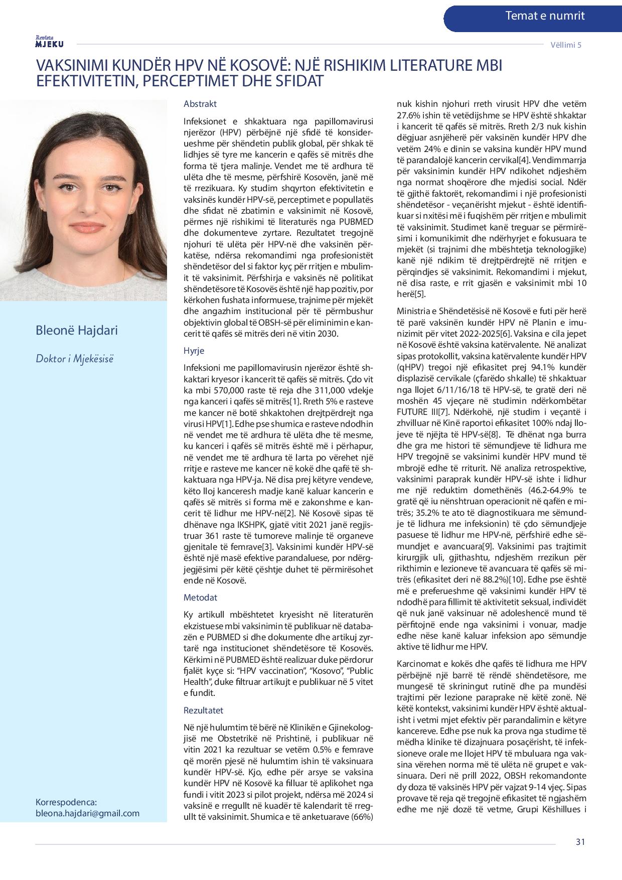 Revista Mjeku, Vëllimi 5, Numër 2; Vaksinimi kundër HPV në Kosovë: Një rishikim literature mbi efektivitetin, perceptimet dhe sfidat, artikull nga Dr. Belonë Hajdani dhe Dr. Linda Çarkaxhiu – Hyseuin.