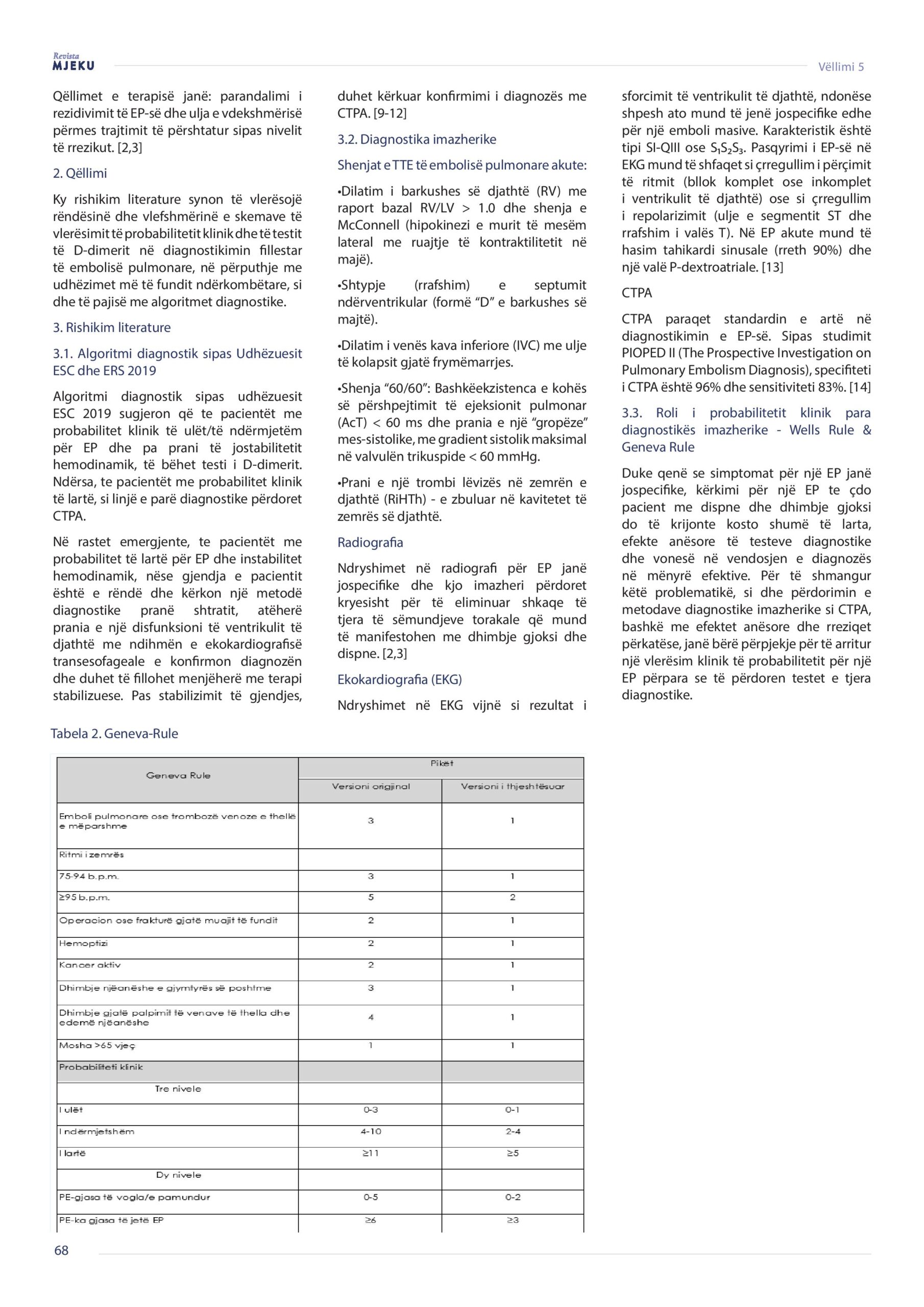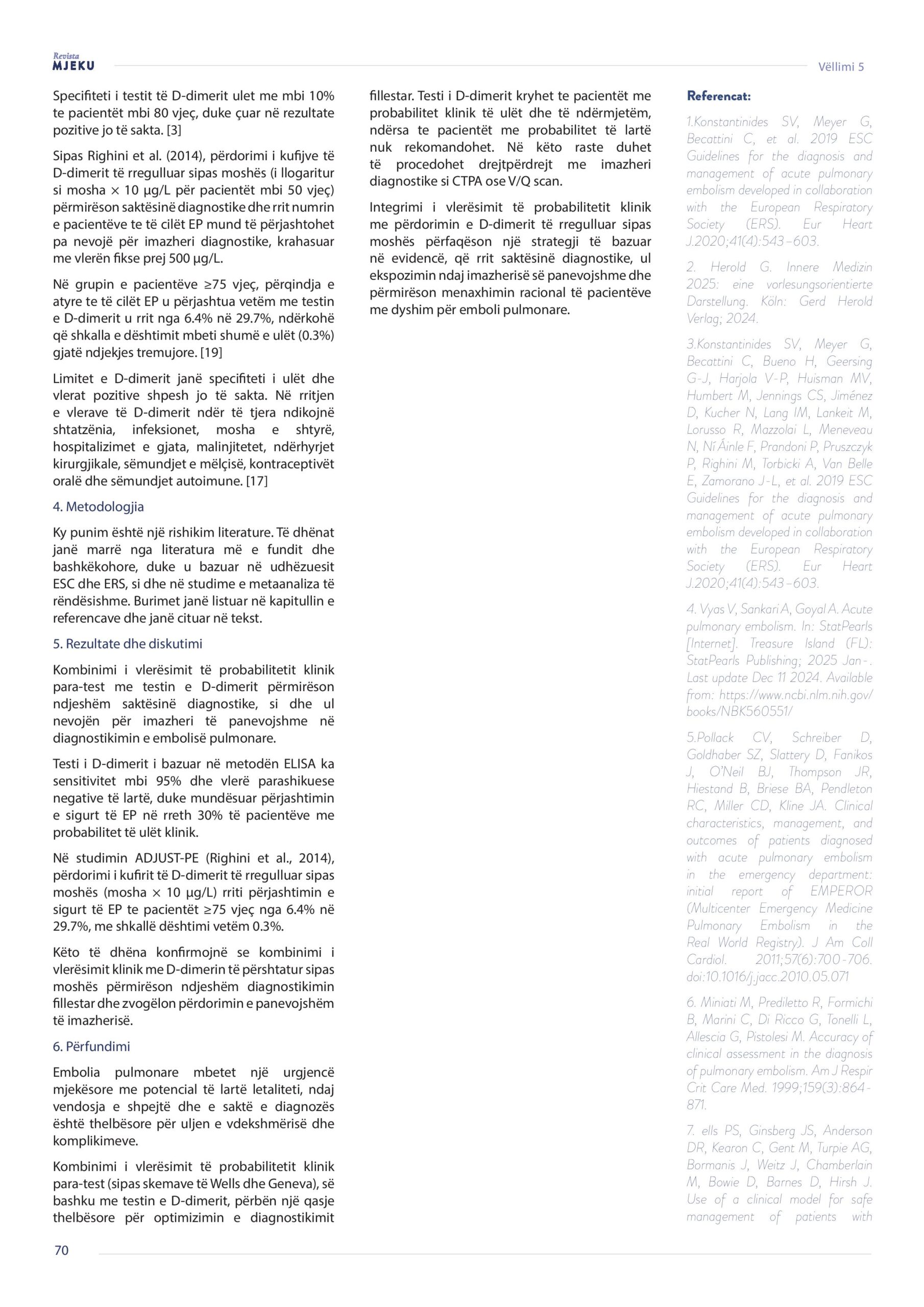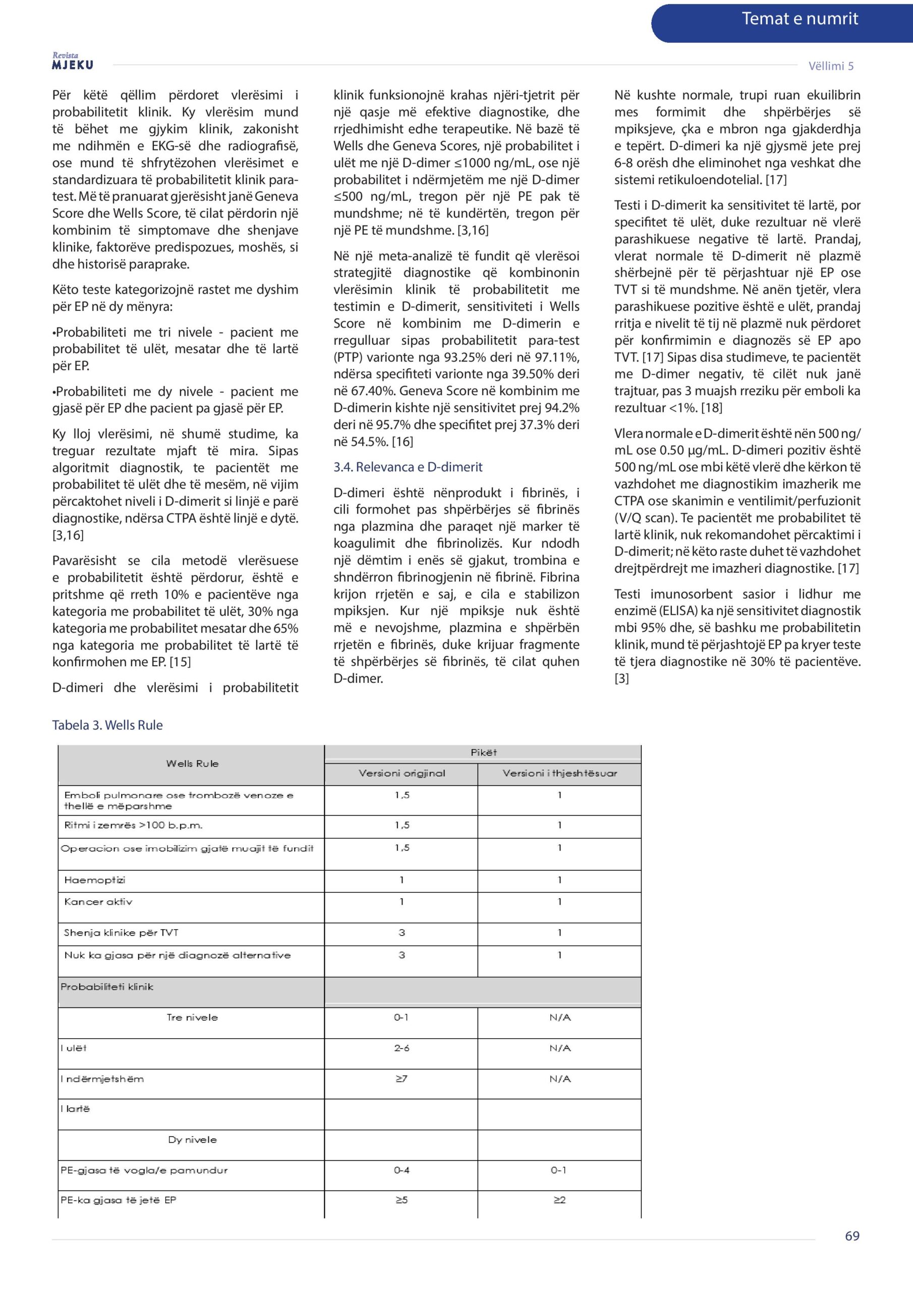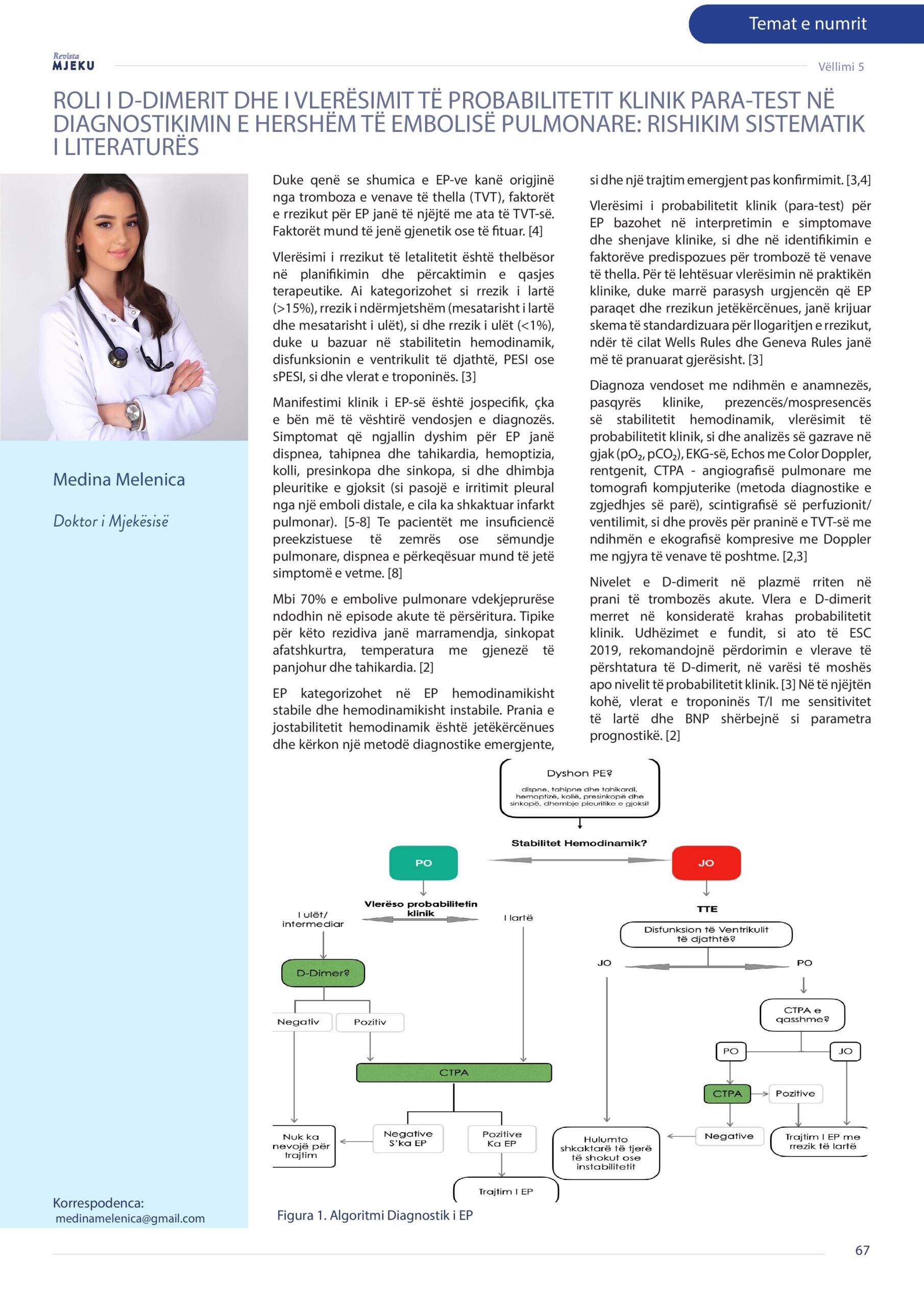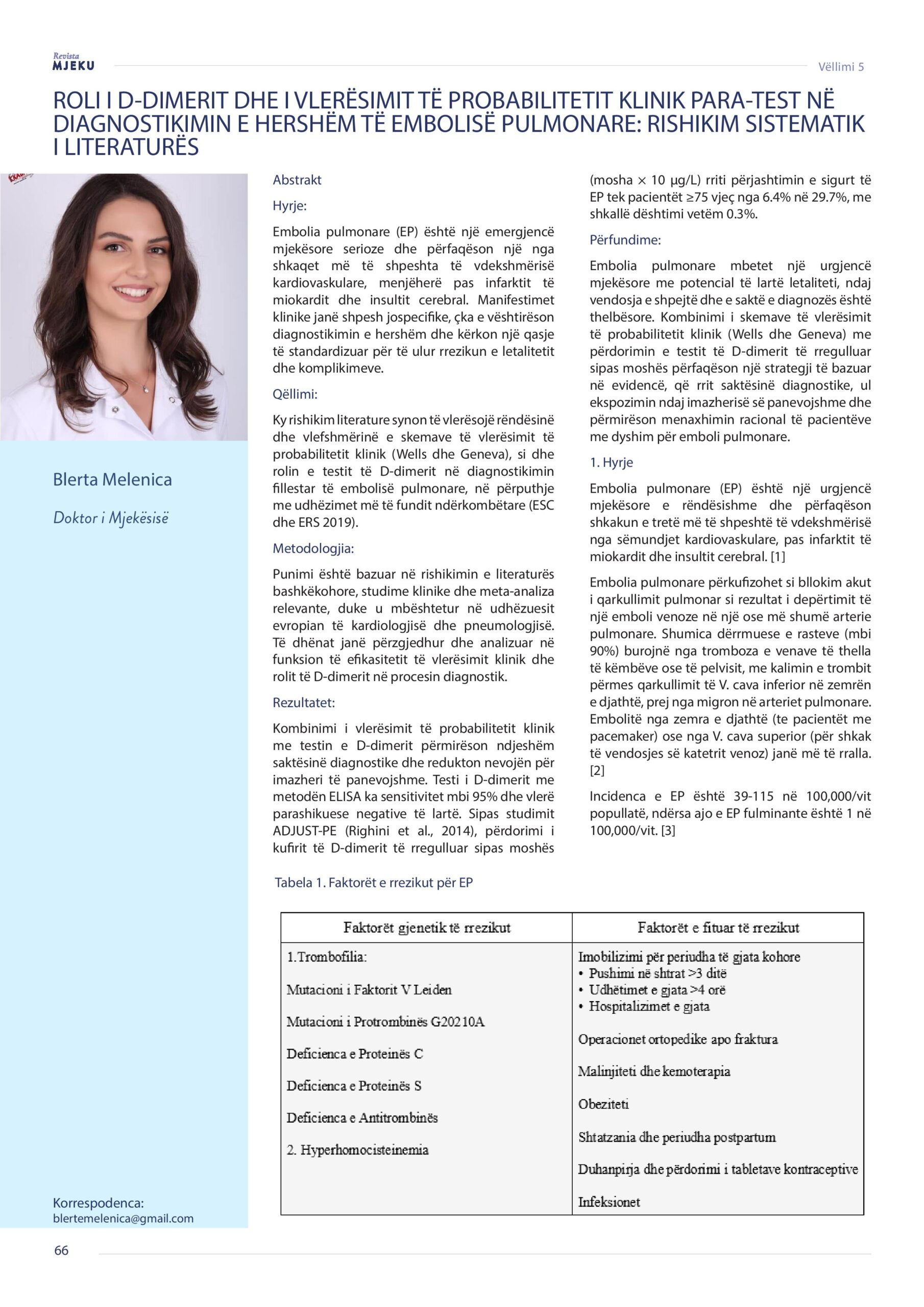 Revista Mjeku, Vëllimi 5, Numër 4; Roli i D-dimerit dhe i vlerësimit të probabilitetit klinik para-test në diagnostikimin e hershëm të embolisë pulmonare: Rishikim sistematik i literaturës, artikull nga Dr. Blerta Melenica dhe Dr. Medina Melenica.