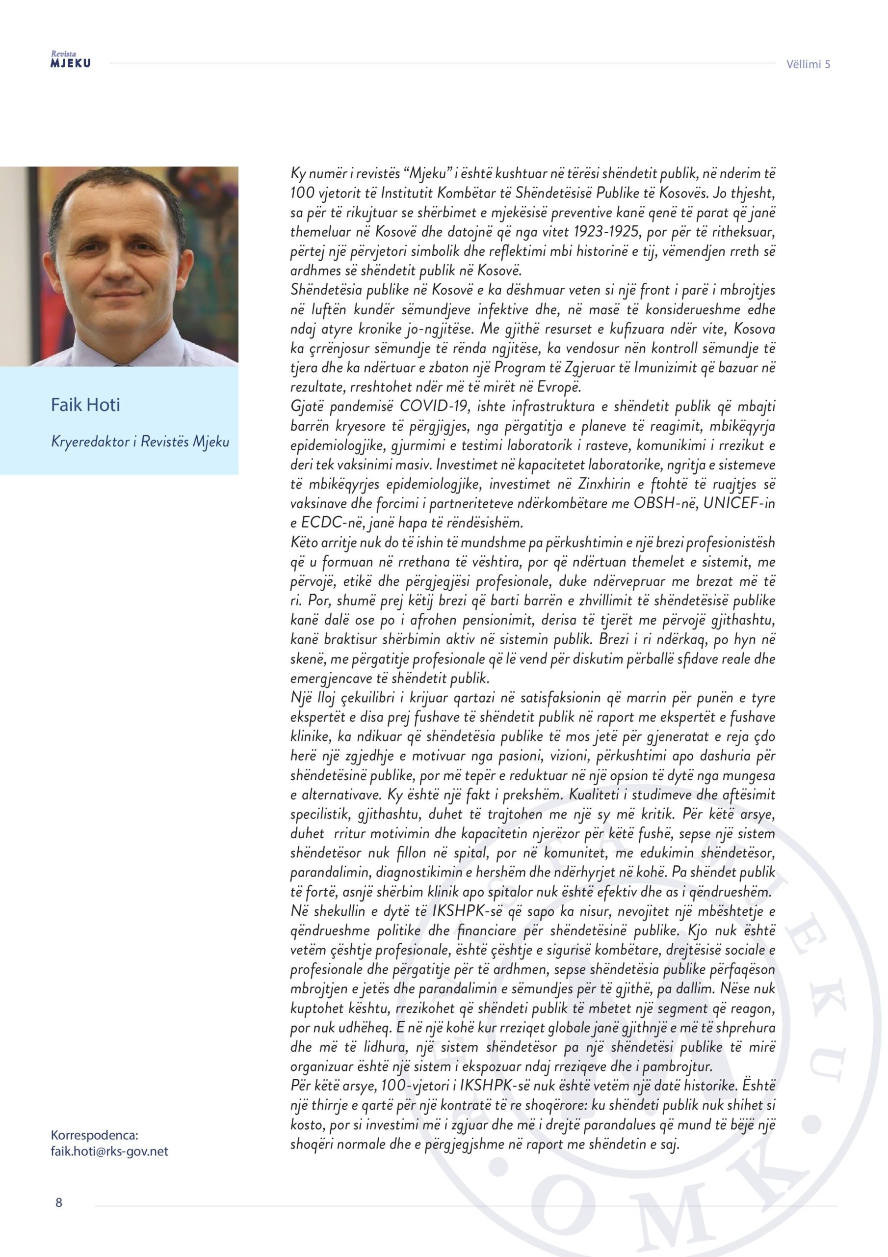 “Ky numër i revistës “Mjeku” i është kushtuar në tërësi shëndetit publik, në nderim të 100 vjetorit të Institutit Kombëtar të Shëndetësisë Publike të Kosovës. Jo, thjesht, sa për të rikujtuar se shërbimet e mjekësisë preventinve kanë qenë të parat që janë themeluar në Kosovë dhe datojnë që nga vitet 1923-1925, por për të ritheksuar, përtej një përvjetori simbolik dhe reflektimi mbi historinë e tij, vëmendjen rreth së ardhmes së shëndetit publik në Kosovë.”
