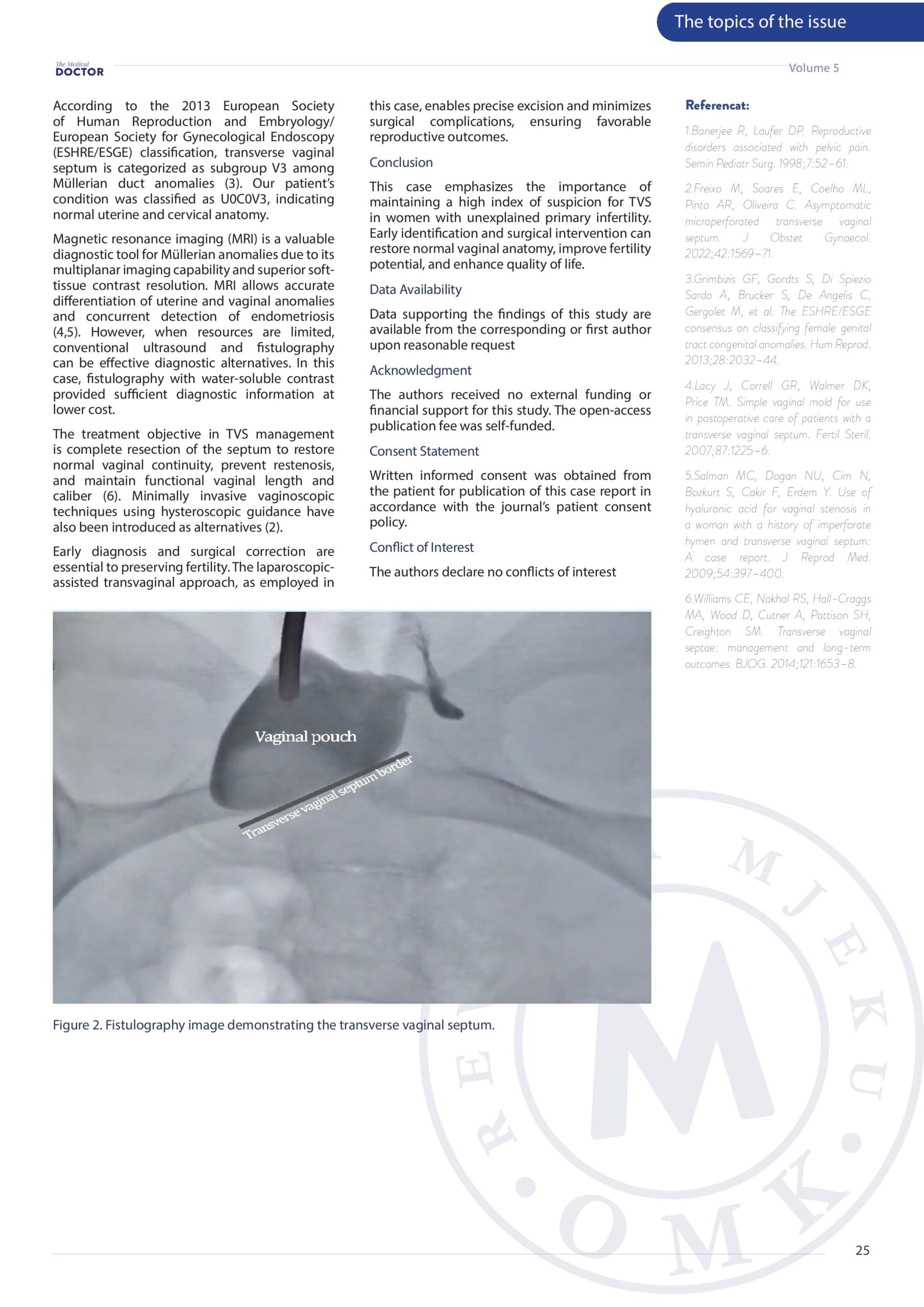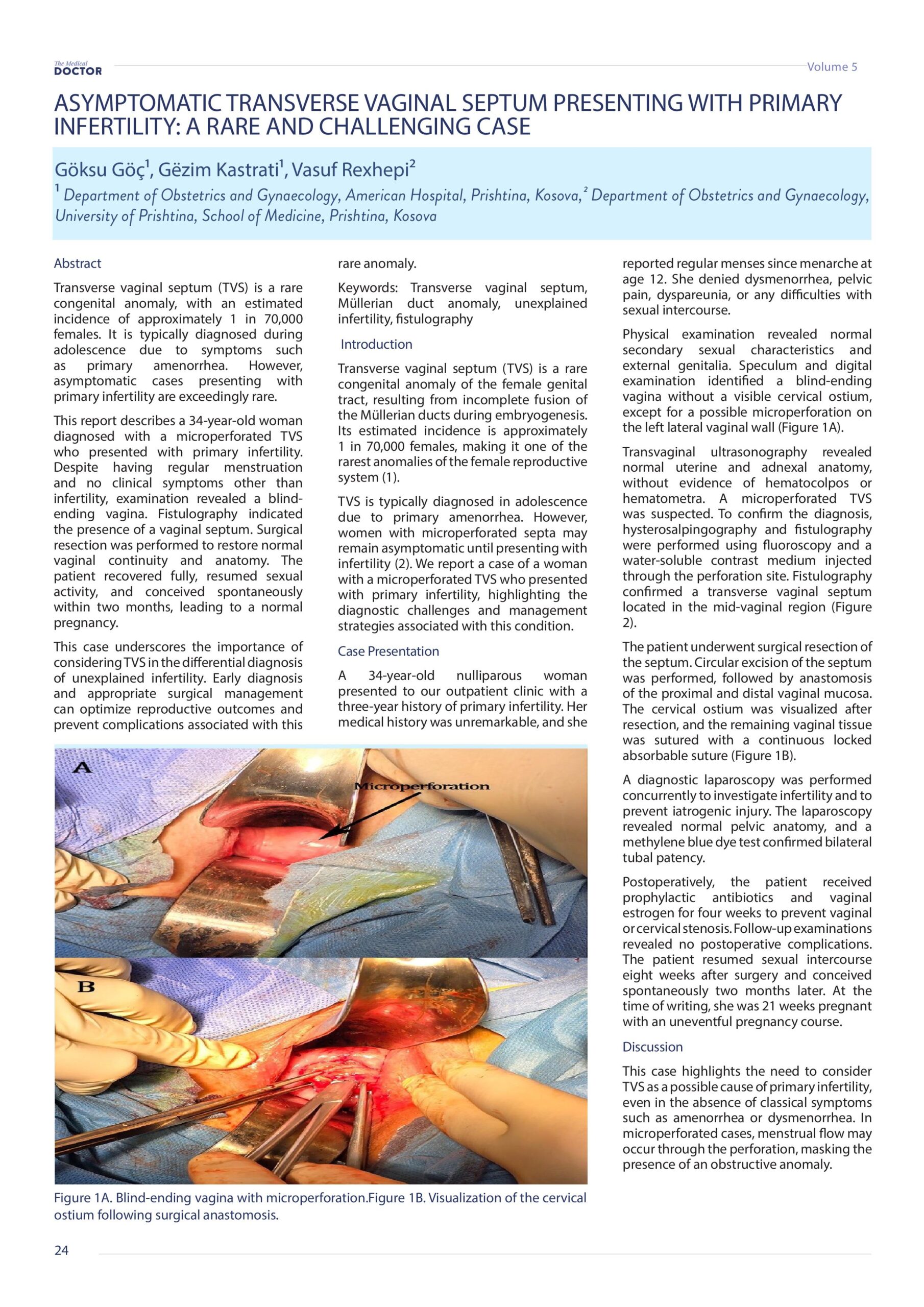 Revista Mjeku, Vëllimi 5, Numër 4, Suplementi shkencor; Asymptomatic transverse vaginal septum presenting with primary infertility: A rare and challenging case, artikull nga Dr. Göksu Göç, Dr. Gëzim Kastrati dhe Dr. Vasuf Rexhepi.