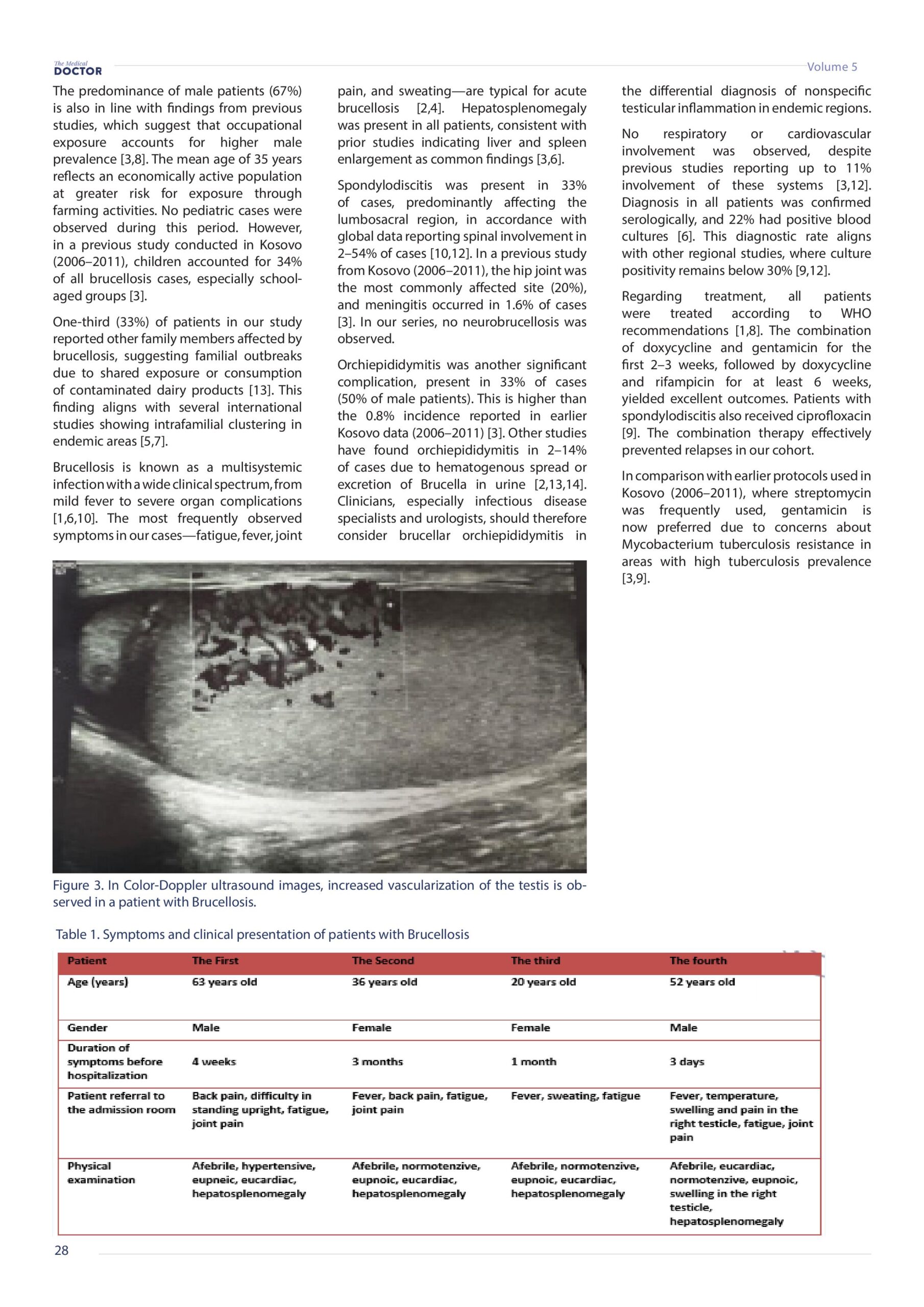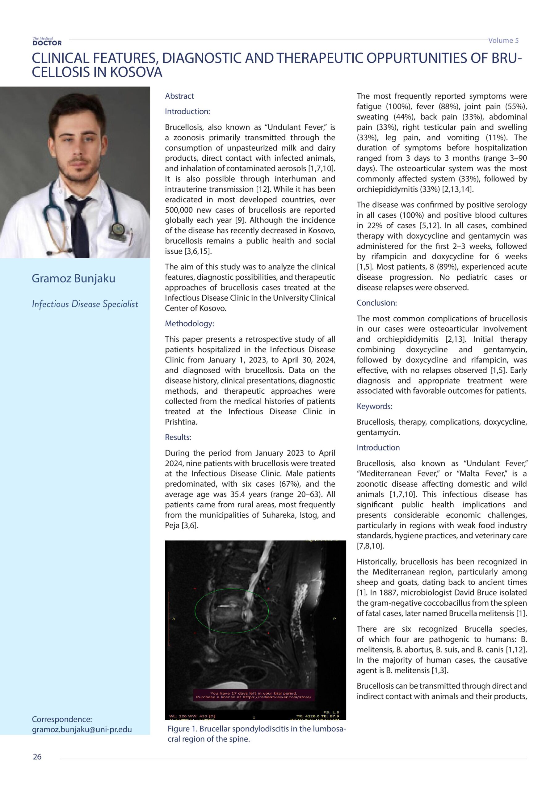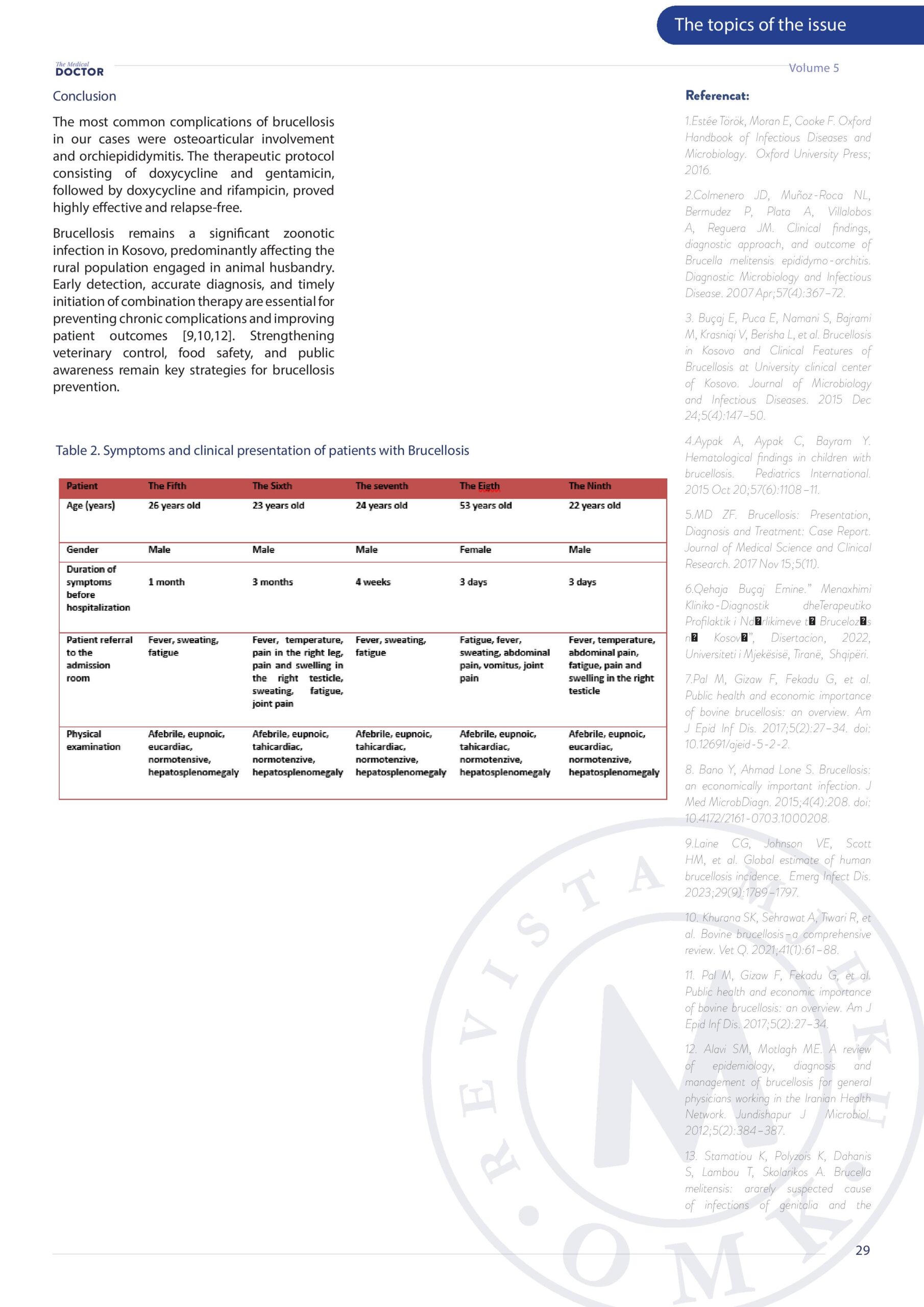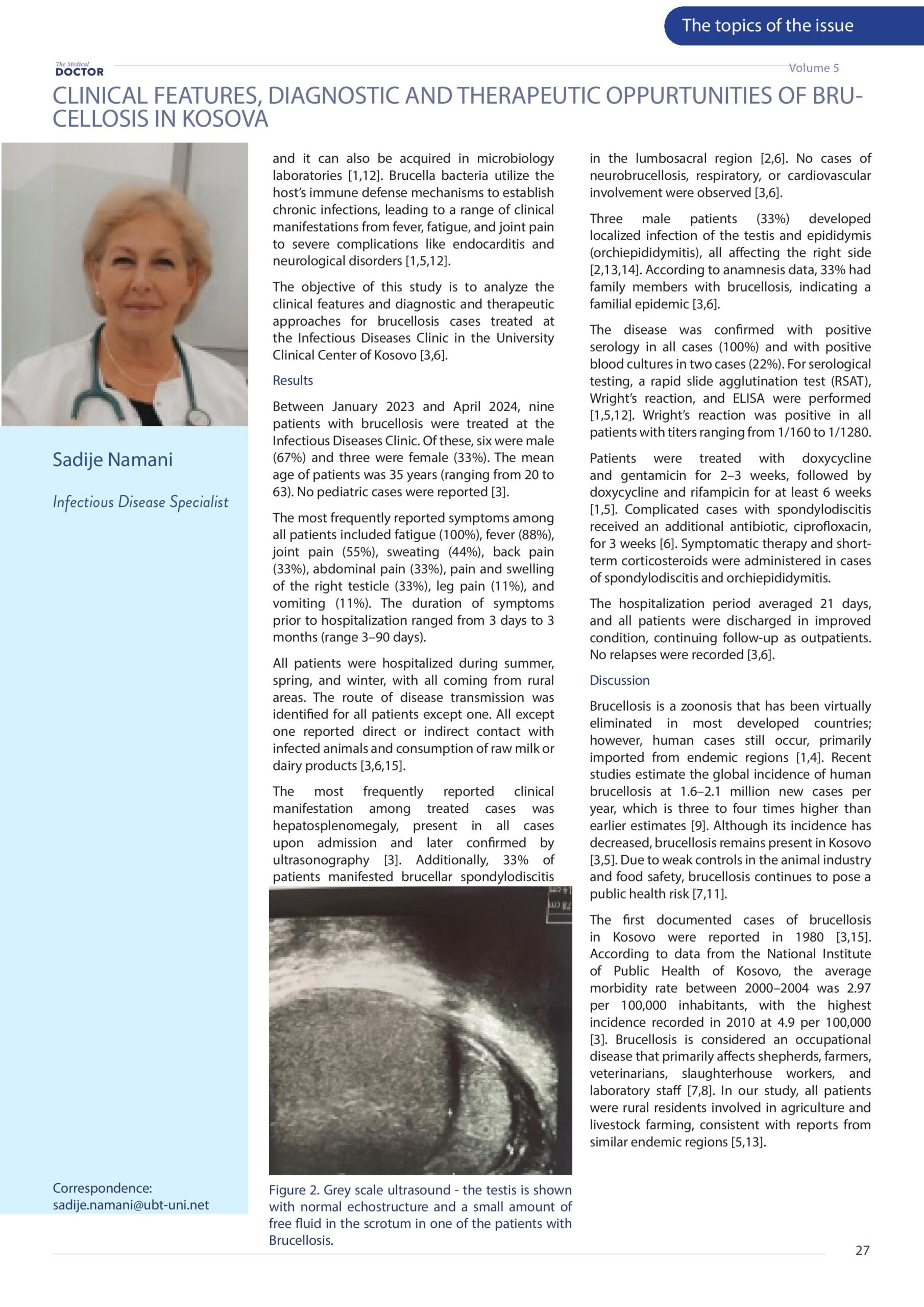 Revista Mjeku, Vëllimi 5, Numër 4, Suplementi shkencor; Clinical Features, diagnostic and therapeutic oppurtinities of brucellosis in Kosova, artikull nga Dr. Gramoz Bunjaku dhe Dr. Sadije Namani.