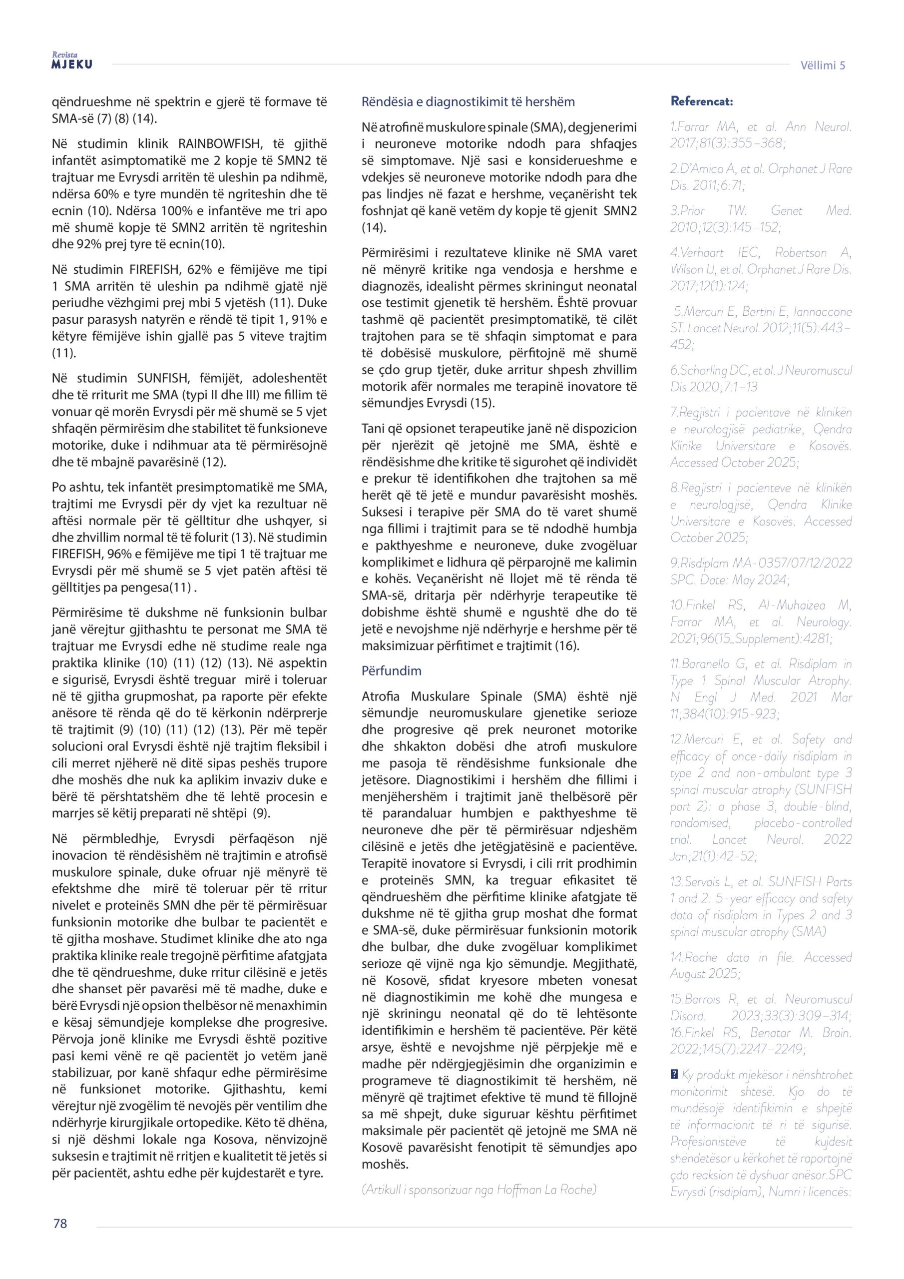 Revista Mjeku, Vëllimi 5, Numër 4; Atrofia muskulore spinale (SMA) në Kosovë – Të dhënat klinike, rëndësia e diagnostikimit të hershëm dhe qasja e hershme në trajtim me evrydsi (RISDIPLAM), artikull nga Dr. Leonora Zogaj dhe Dr. Shpresa Beqiri – Rashiti.