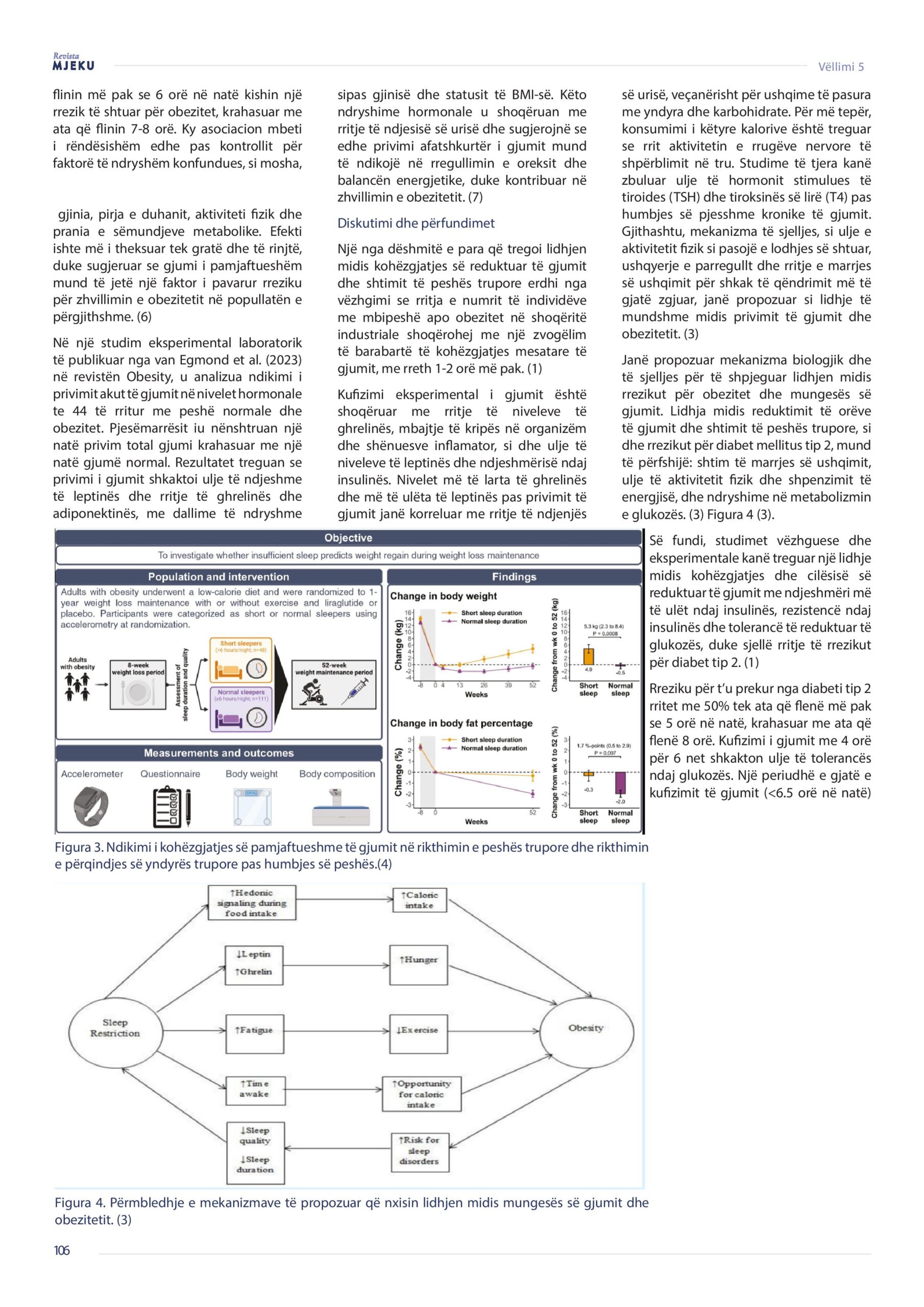 “Gjumi i pamjaftueshëm është identifikuar si një faktor i rëndësishëm rreziku për obezitet. Ky rishikim përmbledh dëshmi shkencore mbi ndikimin e mungesës së gjumit në nivelet e leptinës si dhe ghrelinës – dy hormone që rregullojnë oreksin dhe metabolizmin.”