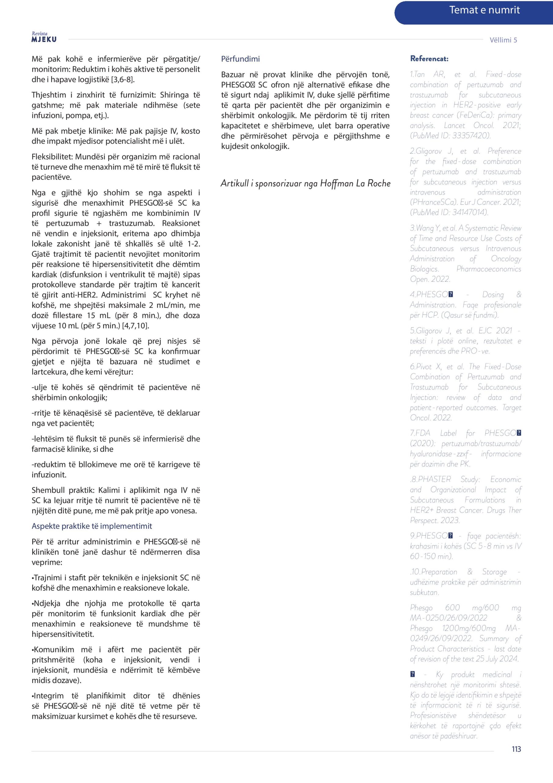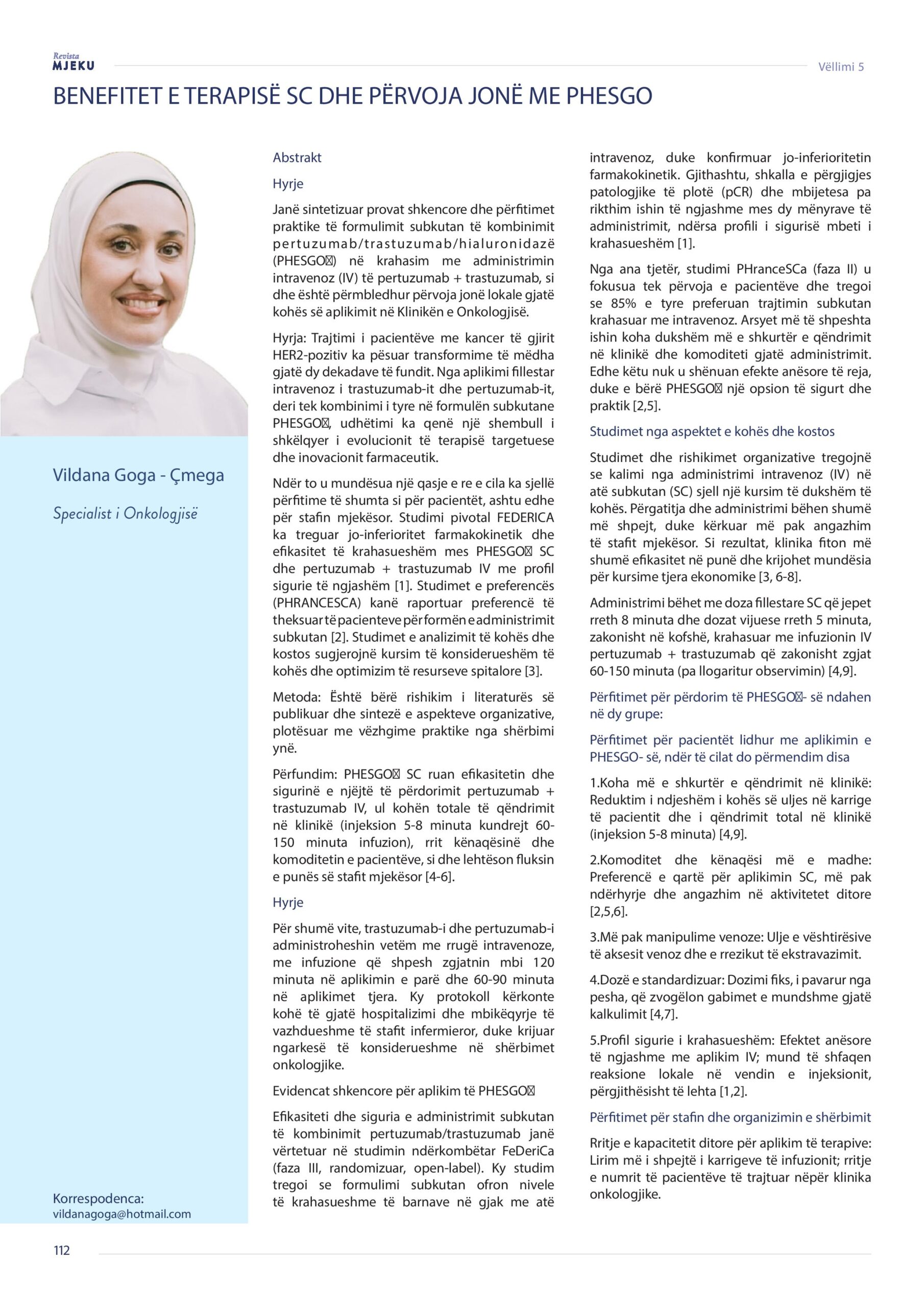 Revista Mjeku, Vëllimi 5, Numër 3; Benefitet e terapisë dhe përvoja jonë me PHESGO, artikull nga Dr. Vildana Goga- Çmega.