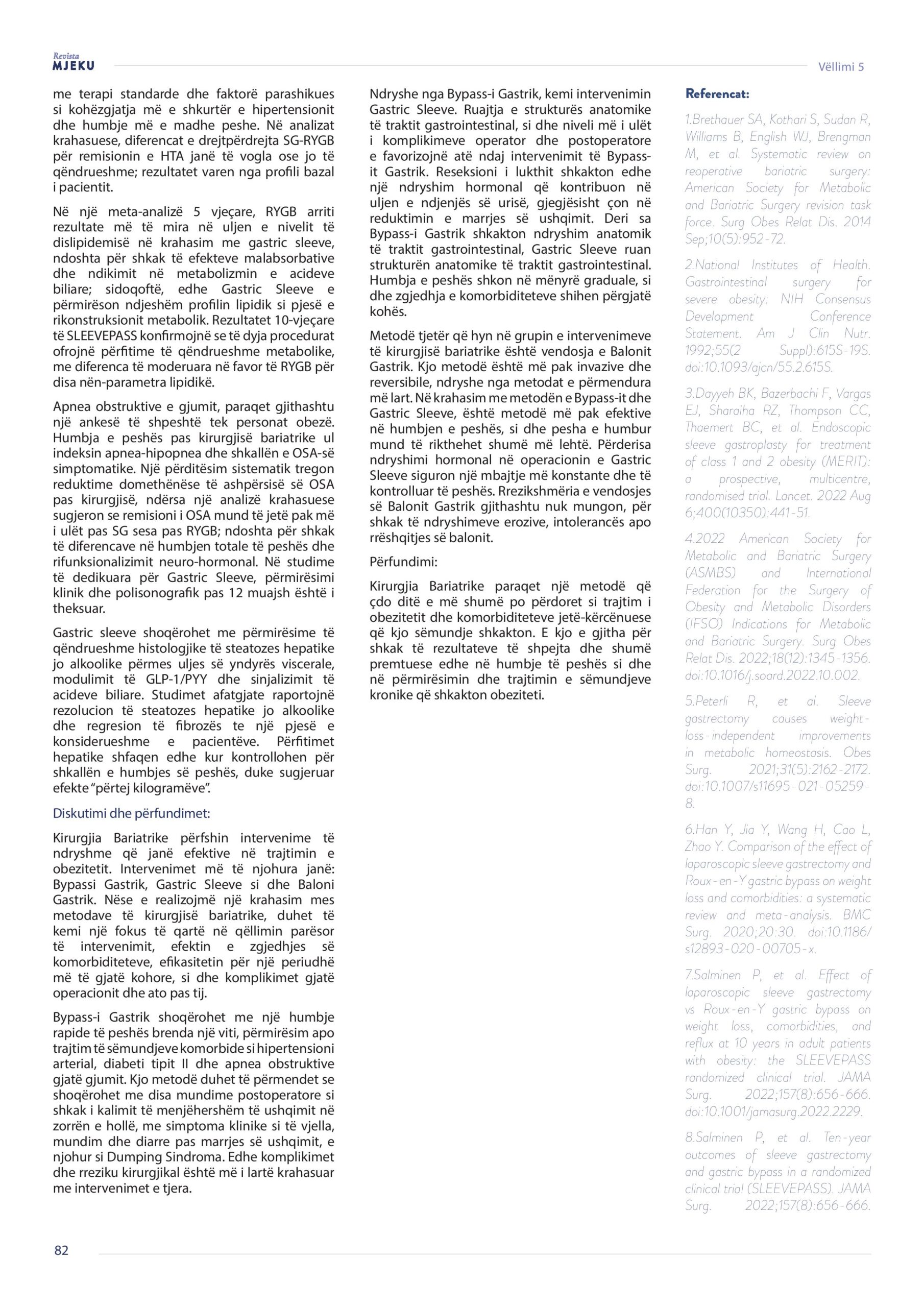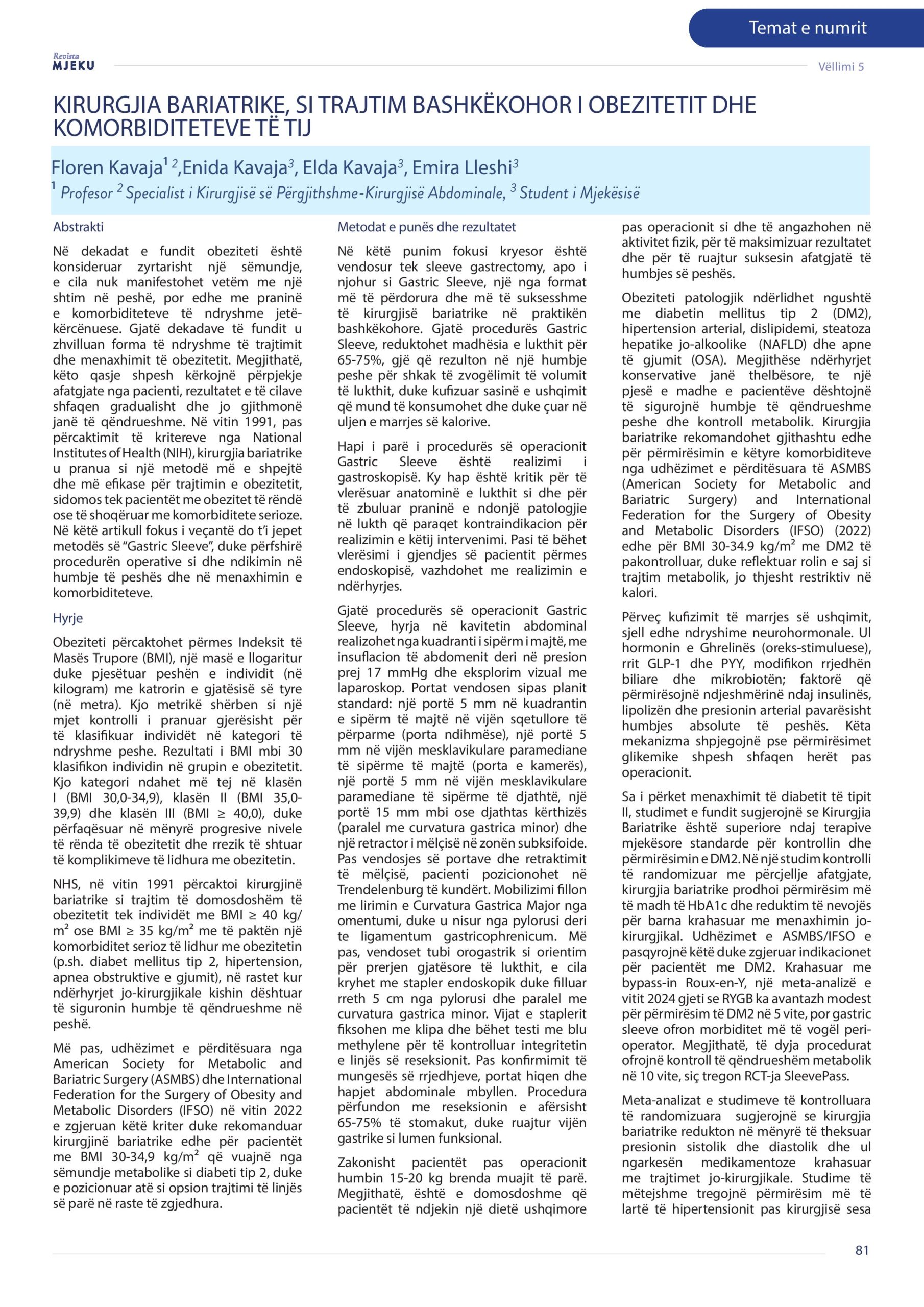 Revista Mjeku, Vëllimi 5, Numër 3; Kirurgjia bariatrike, si trajtim bashkëkohor i obezitetit dhe komorbiditeteve të tij, artikull nga Floren Kavaja, Enida Kavaja, Elda Kavaja, dhe Emira Lleshi.