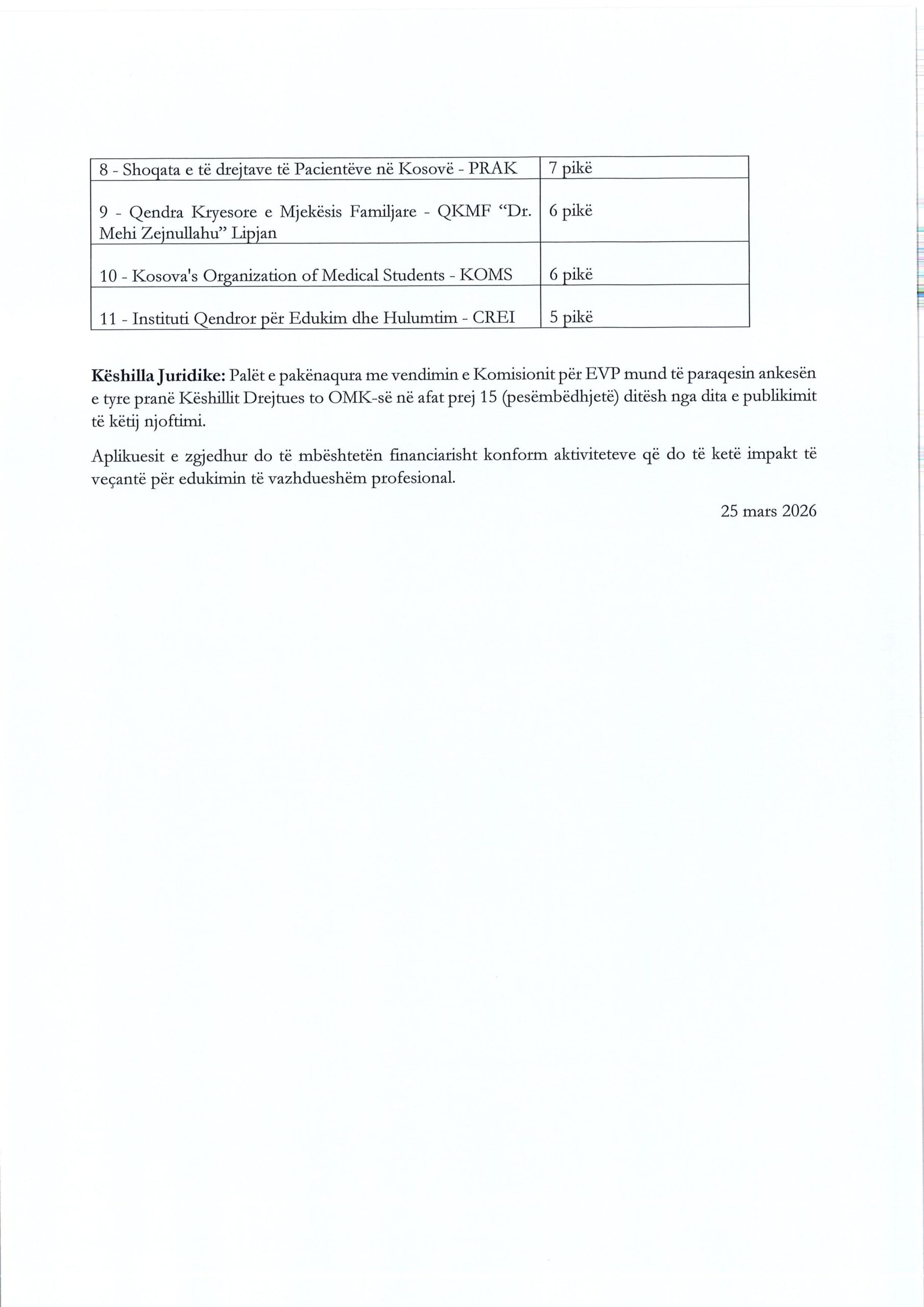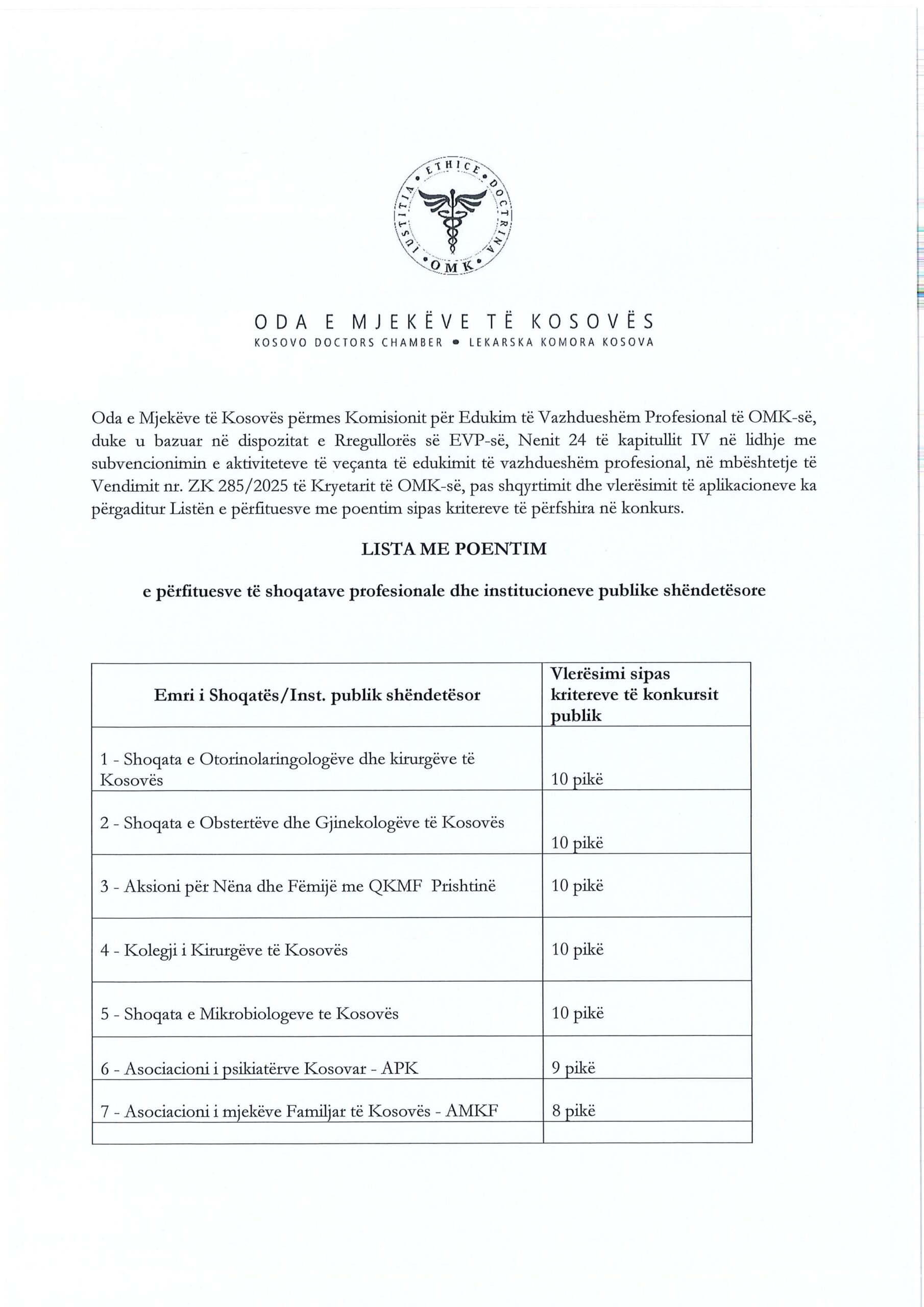 25 Mars 2026Lista e përfituesve me poentim të Shoqatave Profesionale dhe Institucioneve Publike Shëndetësore