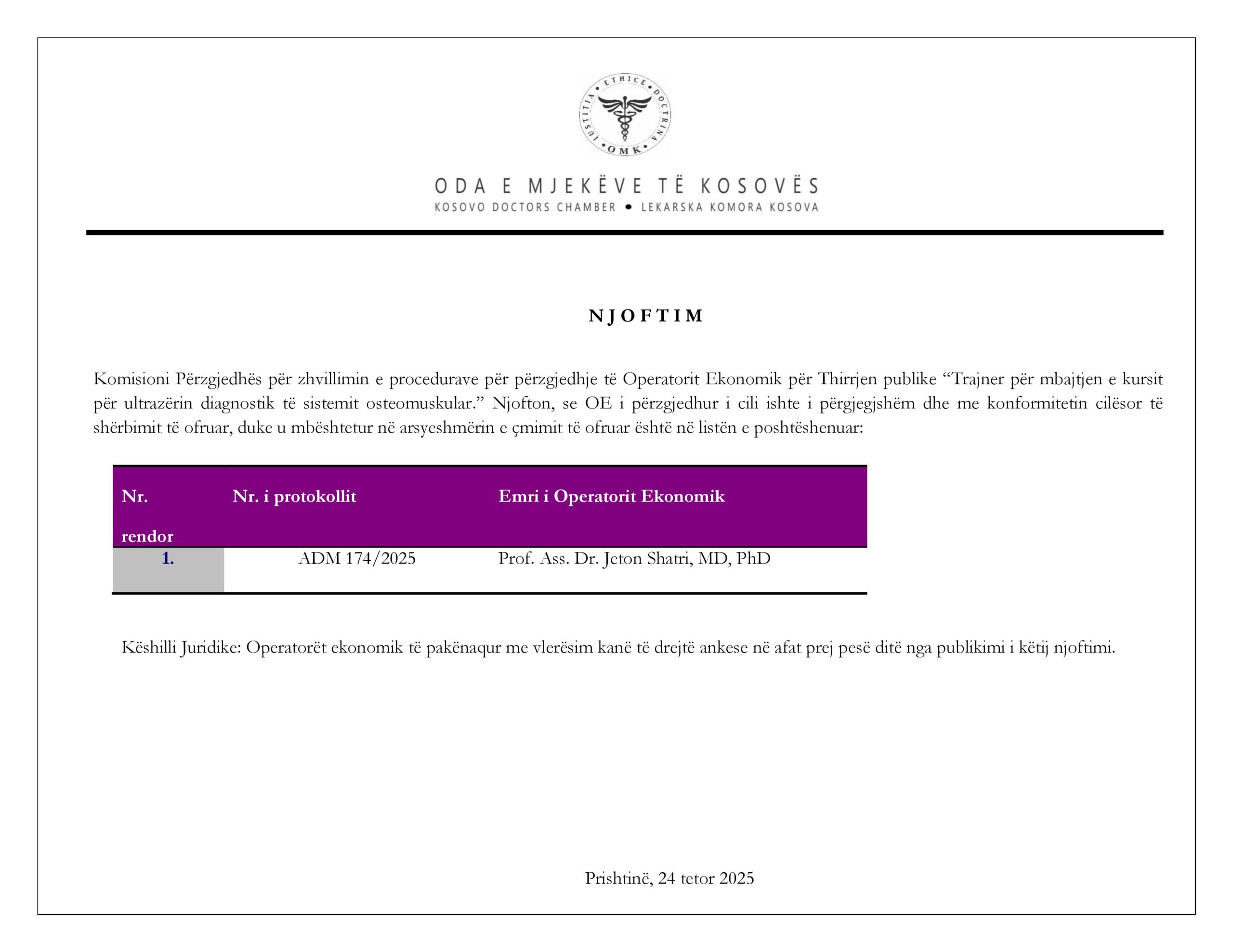 Rezultatet e thirrjes publike për Trajner për mbajtjen e kursit për ultrazërin diagnostik të sistemit osteomuskular