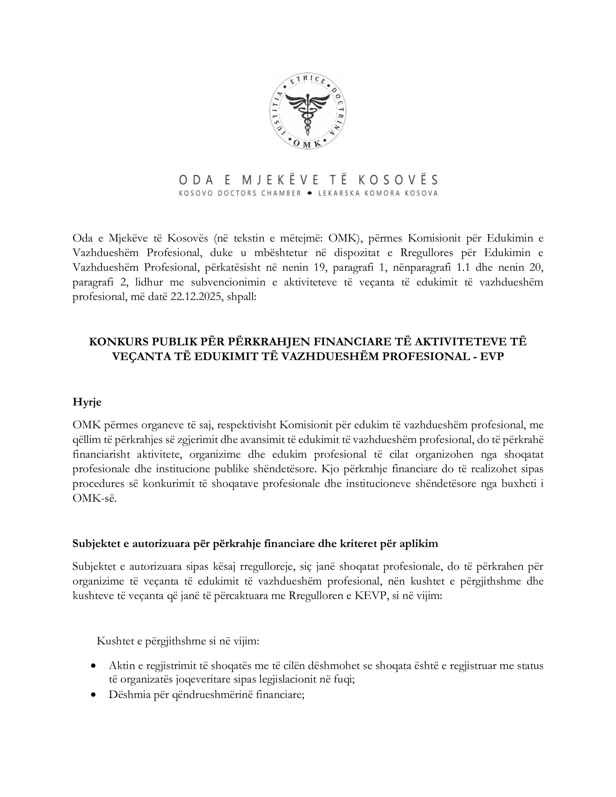 22 Janar 2026SHTYHET AFATI I KONKURSIT PUBLIK PËR PËRKRAHJE FINANCIARE TË AKTIVITETEVE TË VEÇANTA TË EVP-së