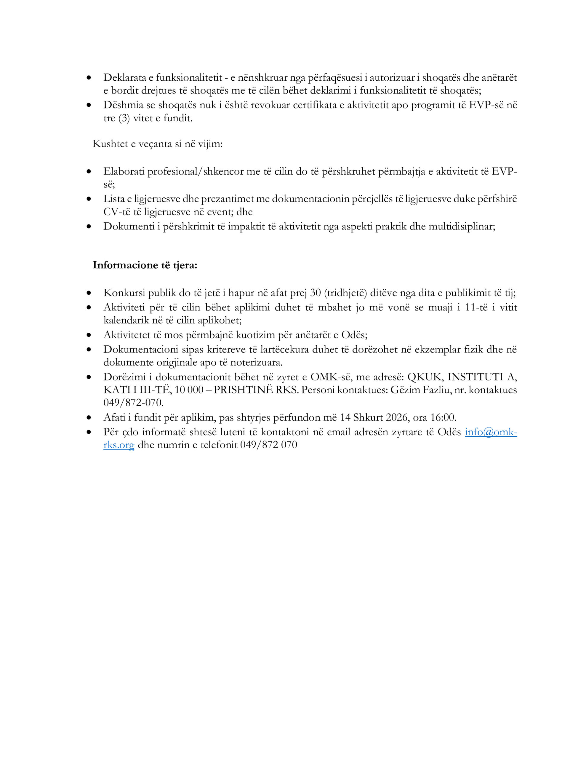 Të gjithë të interesuarit ftohen të aplikojnë deri më 14.02.2026, ora 16:00, duke i dërguar aplikimet në adresën elektronike: info@omk-rks.org.
