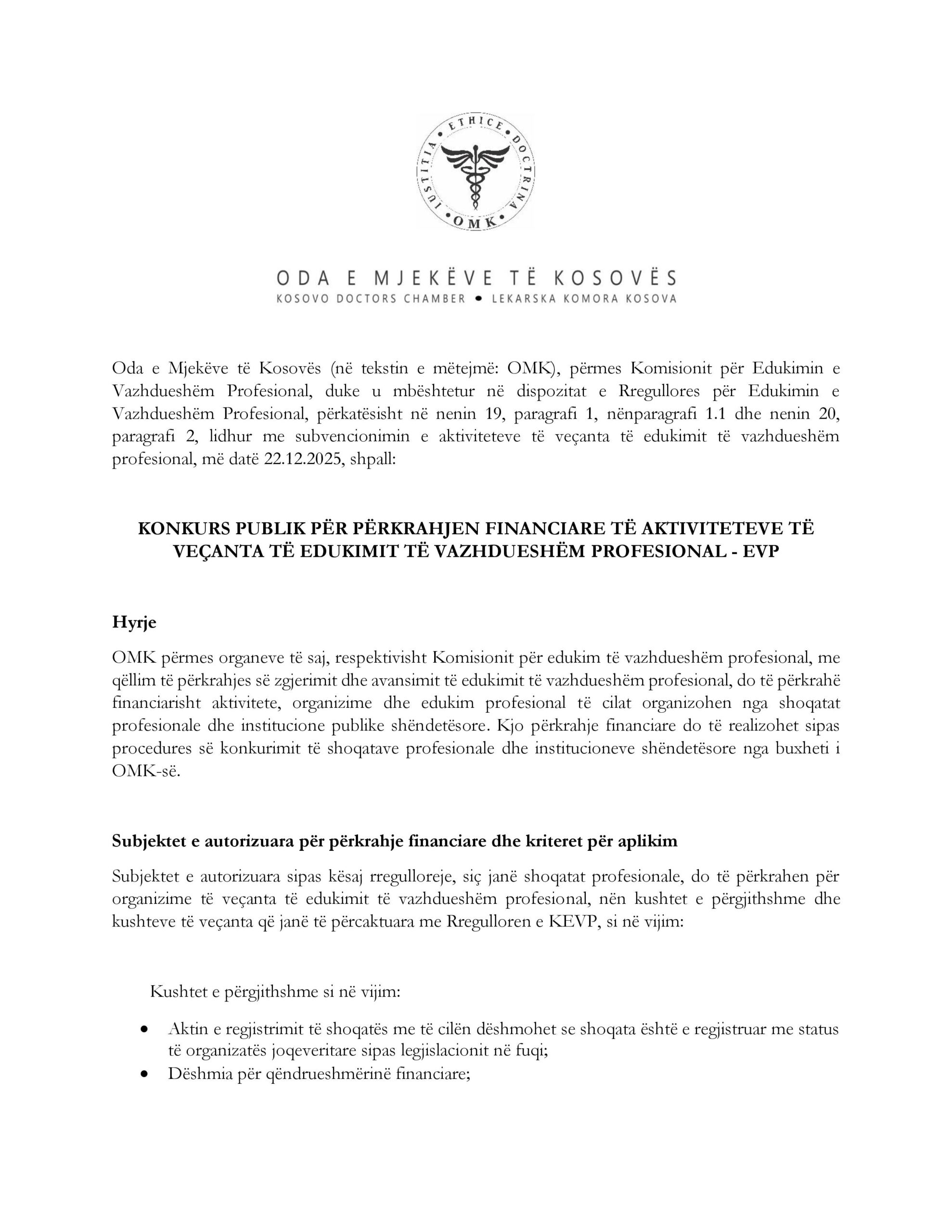 22 Janar 2026SHTYHET AFATI I KONKURSIT PUBLIK PËR PËRKRAHJE FINANCIARE TË AKTIVITETEVE TË VEÇANTA TË EVP-së