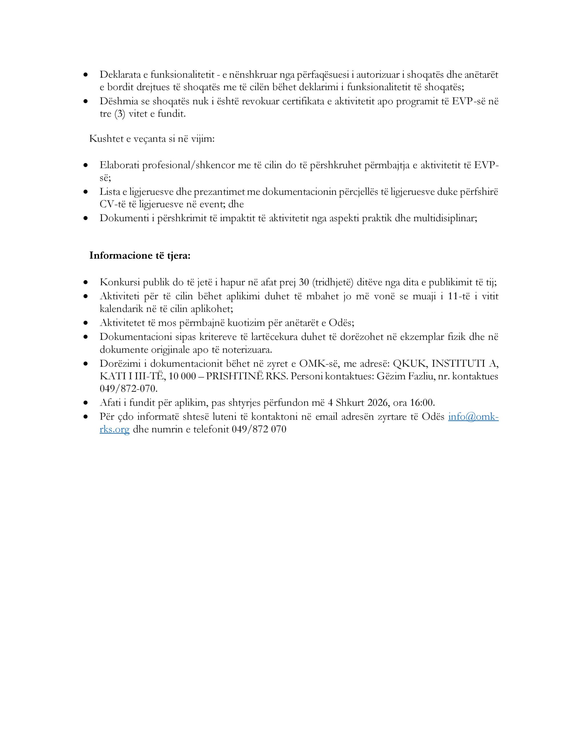 Të gjithë të interesuarit ftohen të aplikojnë deri më 04.02.2026, ora 16:00, duke i dërguar aplikimet në adresën elektronike: info@omk-rks.org.